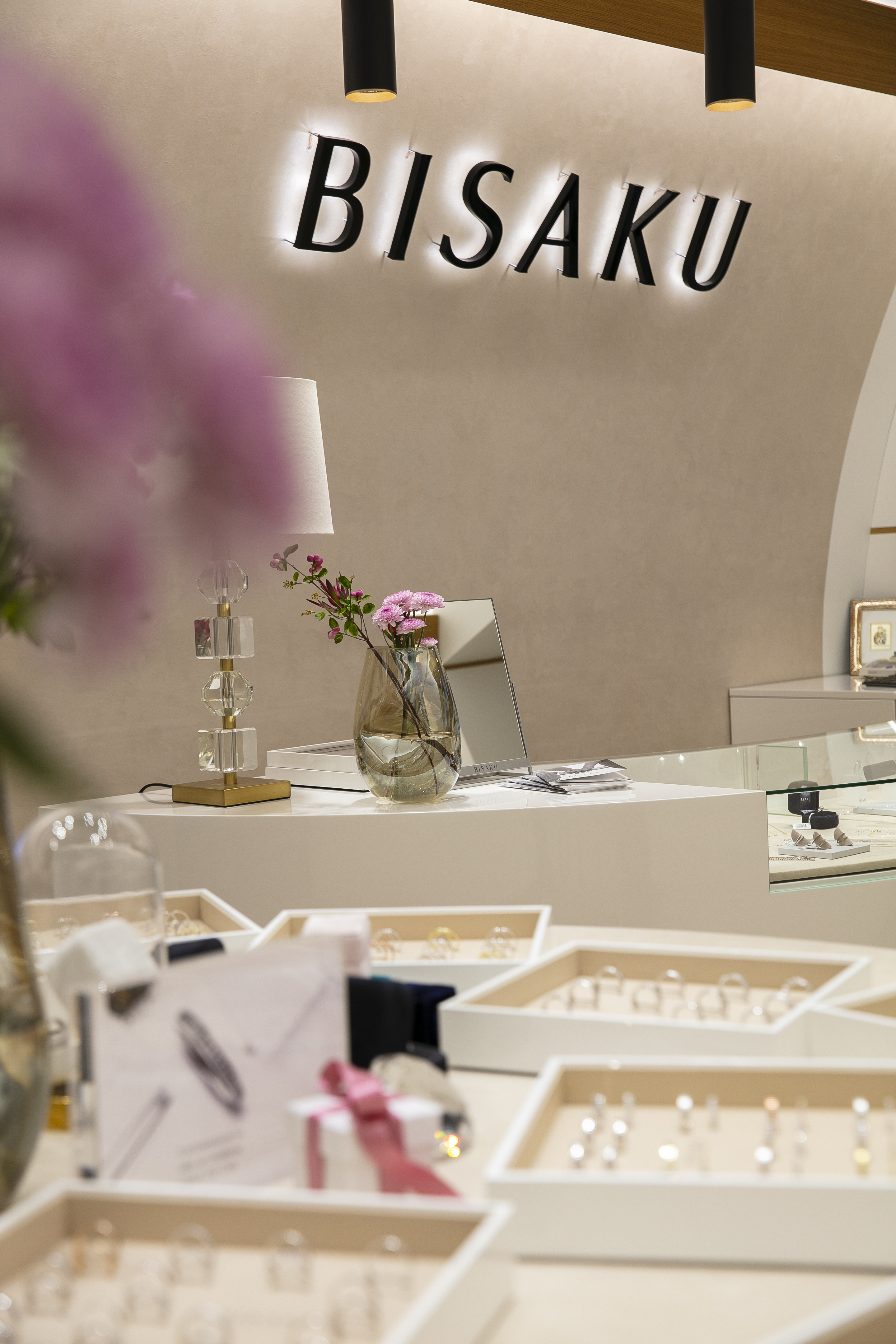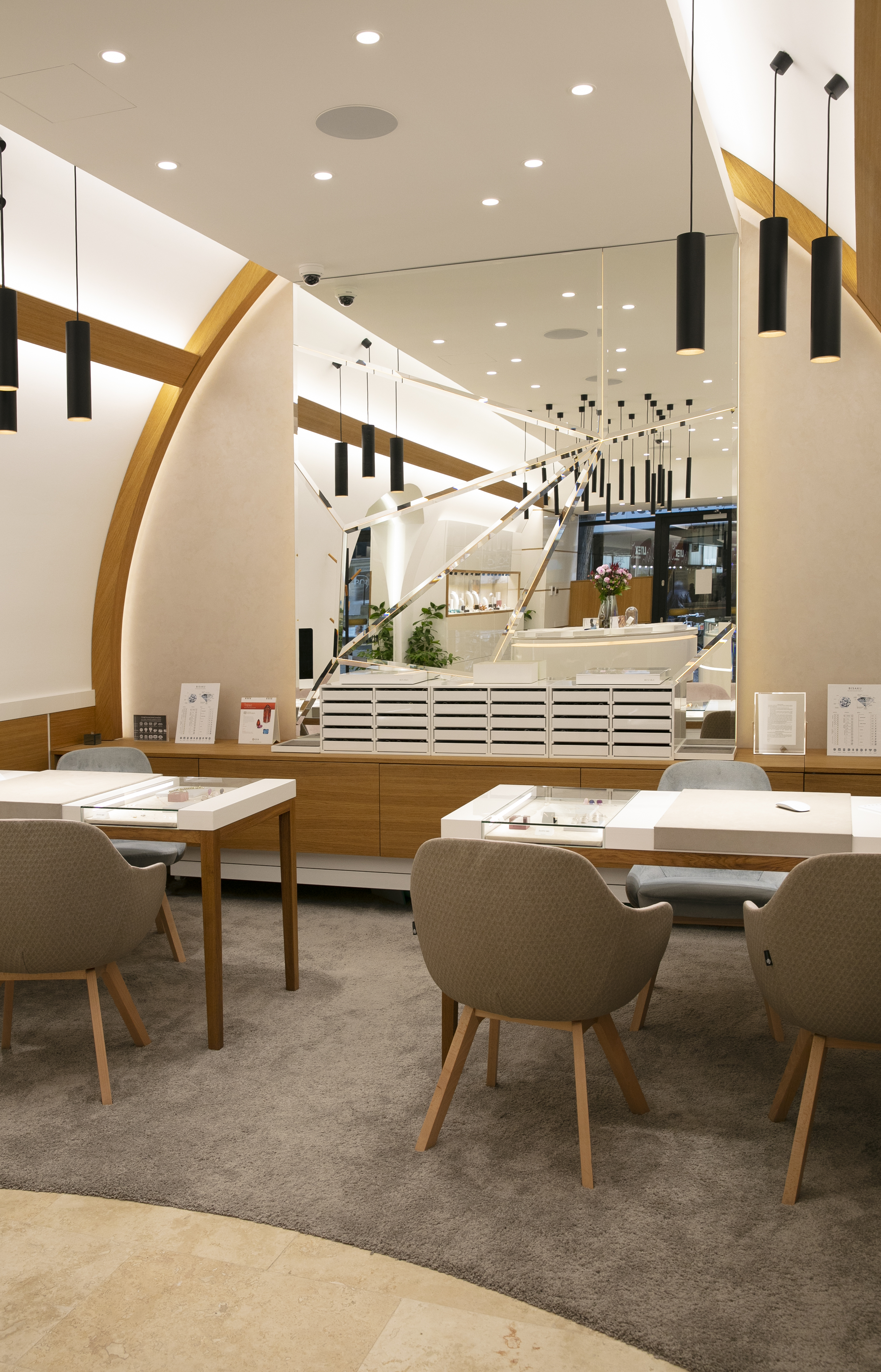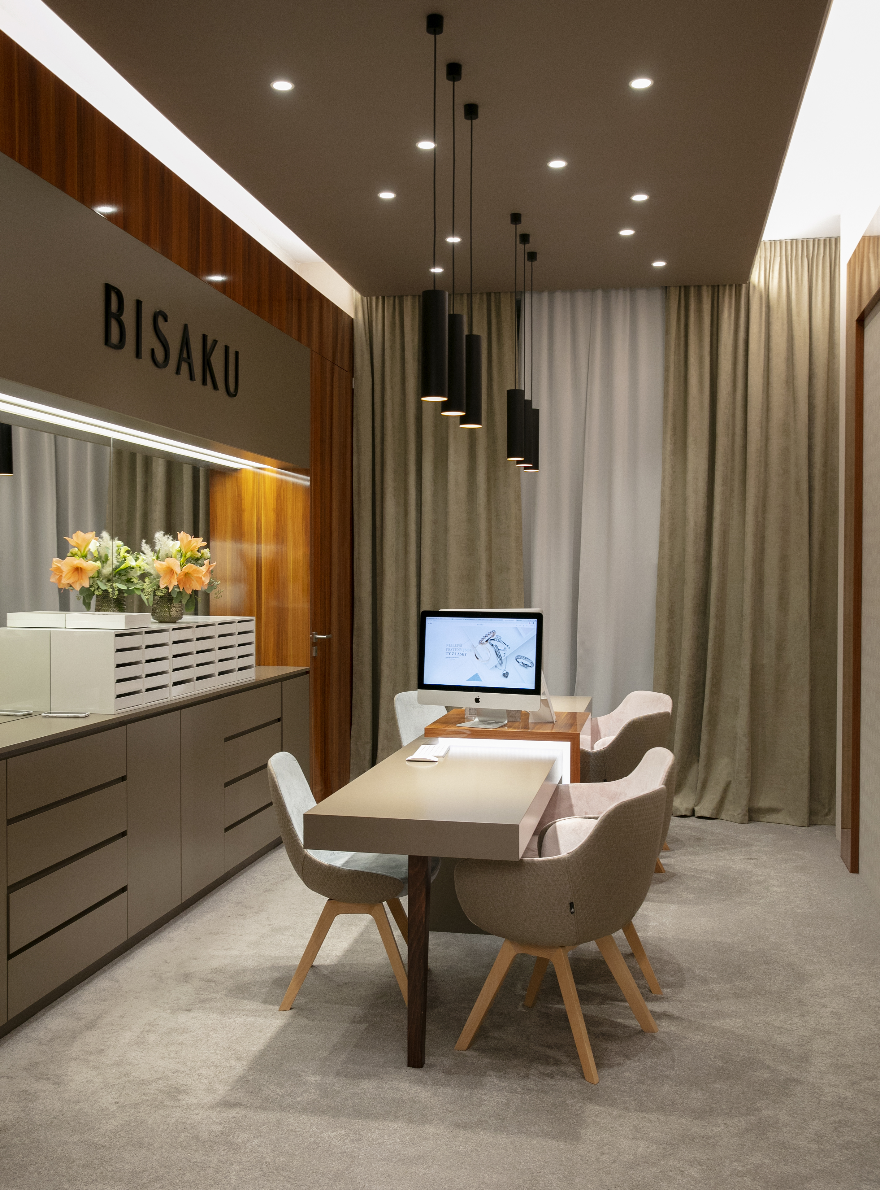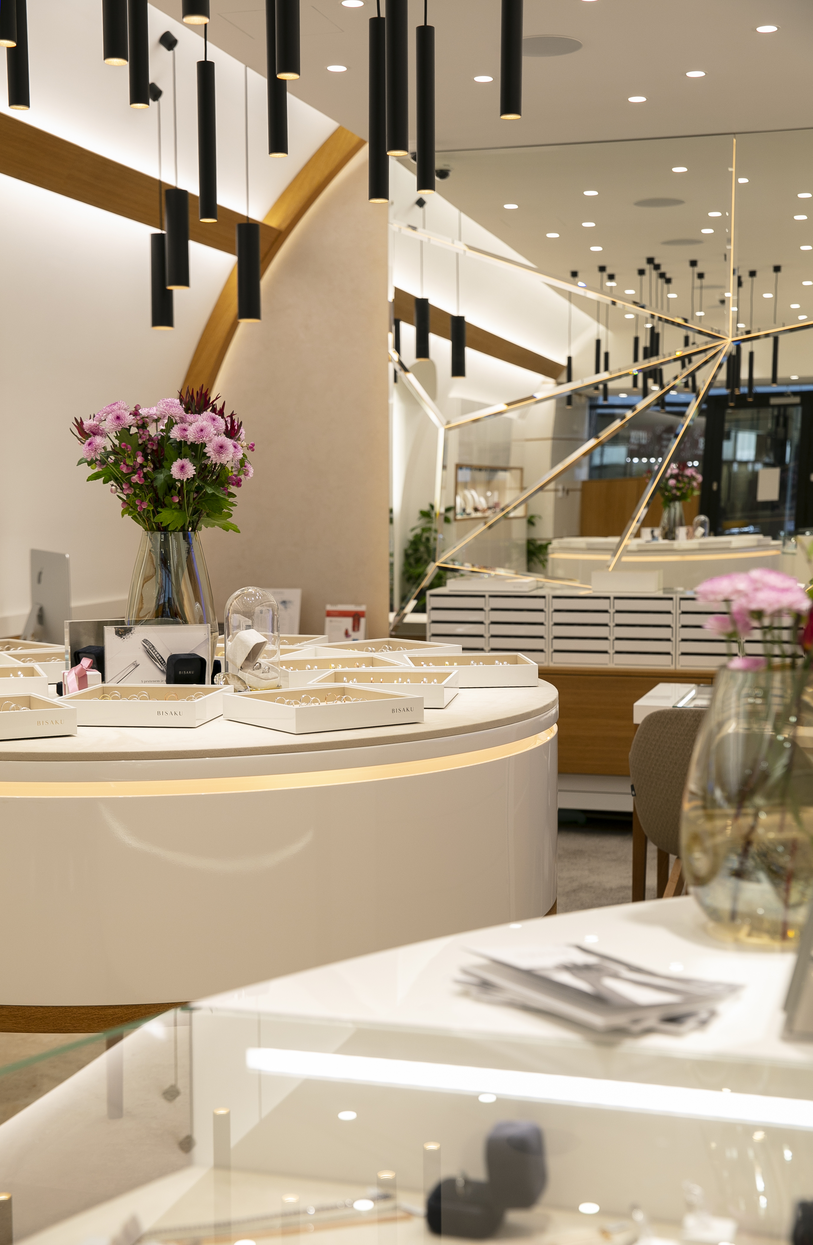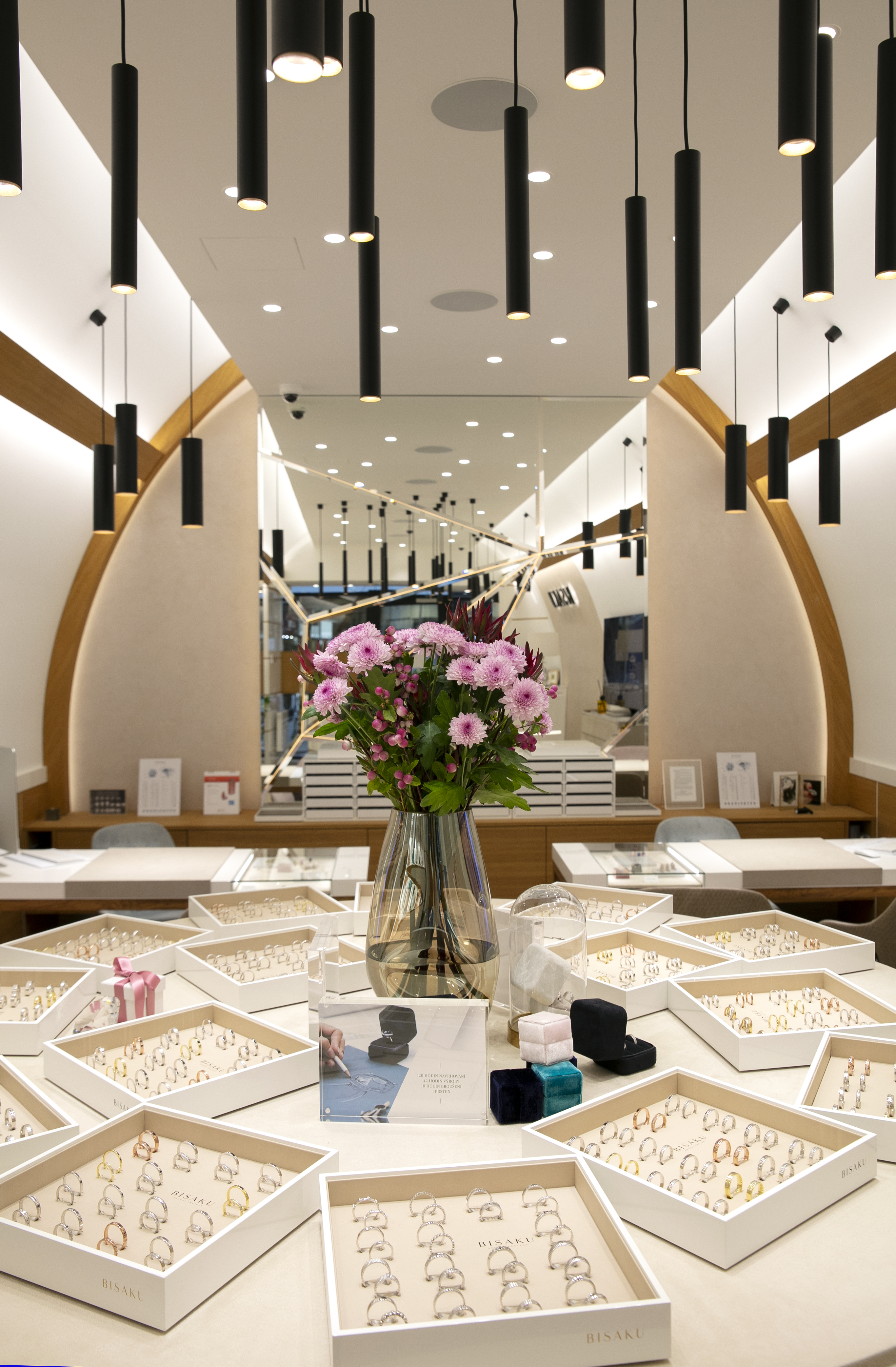 Osvětlení v BISAKU není jen funkční – je součástí celkového zážitku. Pomáhá zvýraznit lesk diamantů a jemné zpracování prstenů, zároveň vytváří klidnou a elegantní atmosféru, ve které se zákazníci cítí dobře.